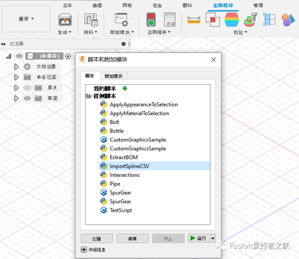 使用过其它三维软件的设计人员可能对导入Excel数据进行参数化设计会有所了解。特别是一些复杂的外形轮廓或轨道等形状,它们需要通过计算得出一些坐标点,进而用这些点位来生成截面或路径。今天我就来说一下如何在Fusion 360里面导入坐标数据生成样条曲线。首先需要准备好数据,一般是Excel的数据,这些数据要Fusion360能够直接读取的话,可以是按照三列数据的形式,分别对应X、Y、Z坐标,单位默认使用的是mm。然后把Excel数据导出成CSV格式的文件。最后在Fusion 360中新建文件,找到实用程序->附加模块->脚本和附加模块->样例脚本中找到ImportSplineCSV,然后点击右下方的运行按钮,在弹出的对话框中选择前面保存的CSV格式的文件,点击打开后,一条按照顺序连接各个空间点的样条曲线就创建出来了,这样就节省了绘制草图的时间,随后就可以使用这个样条曲线作为截面会路径去创造复杂的模型了。