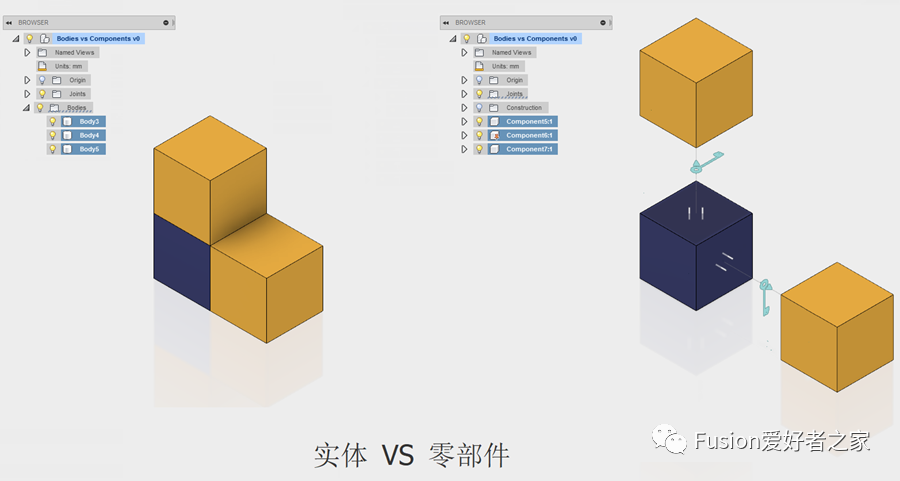 首先,您需要了解,一旦你创建了一个新的Fusion设计,它已经是一个零部件,此外,它将始终是设计的顶级组件。默认情况下,您创建的第一个三维特征将开始形成设计的第一个实体,从而形成零部件。零部件可以包含一个或多个实体。不过,通常情况下,随着设计成型并在模型中创建运动,您只希望在每个零部件中看到一个实体。