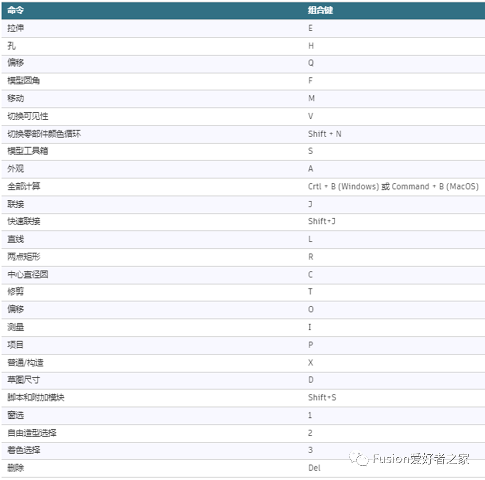 在Fusion 360中使用快捷键可以很好地提升建模速度和效率,一些常见的快捷键如下表所示。Fusion 360的键盘快捷键是支持自定义的,您可以通过单击菜单中每个命令旁边的省略号按钮为任何命令设置快捷方式。不仅在设计工作空间支持快捷键,您也可以在其他工作空间,如渲染、衍生式设计等工作空间定义命令快捷键。
