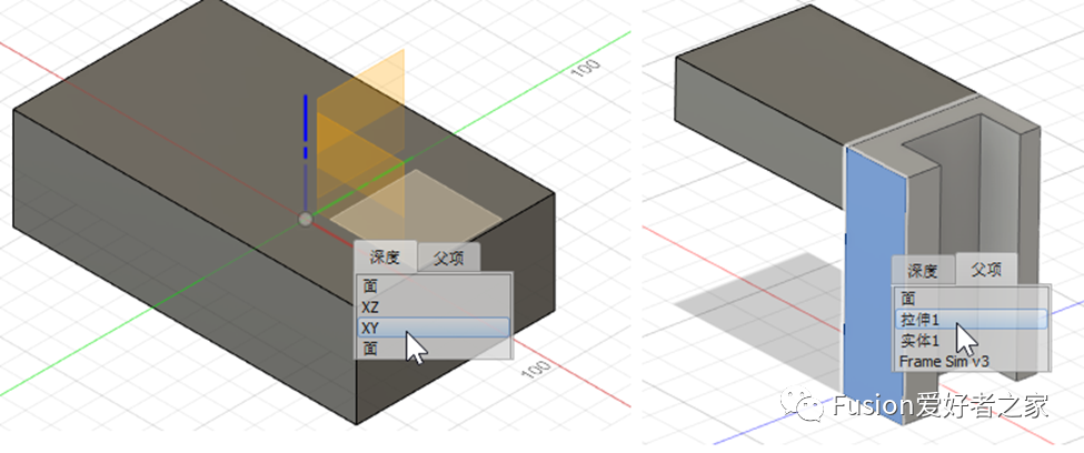 刚开始使用Fusion 360的时候,可能你不知道如何来实现选择其他(前两天,有个用户给我发微信说他终于知道怎样在Fusion 360里面选择其他了,其实我刚开始接触Fusion 360的时候,也花了好几天才搞清楚这个功能)。在对基础特征建模后,如果要将截面草图放置在不同的WCS平面上,则在开始创建草图时,需要使用选择其他这个功能来定位草图所在平面,此时就显得非常有用了。或者在一些较为复杂的模型中,您想选择被遮挡的点、边、面等但却不想频繁地旋转模型。或当您要在图形窗口中选择点、线、面所依附的特征或零部件的父部件时。在Fusion 360中你只需按住鼠标左键,在不移动光标的情况下,光标头端将弹出一个两个选项卡的对话框,选项如下: