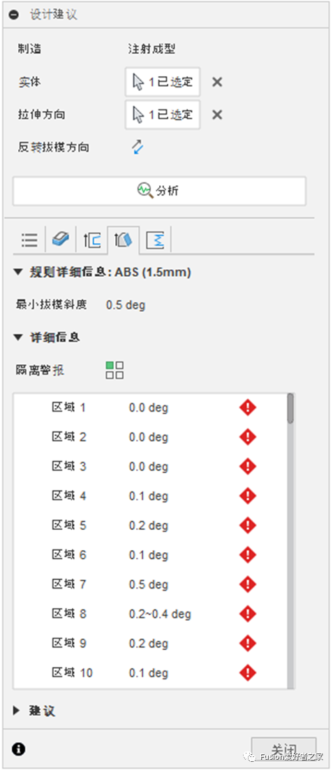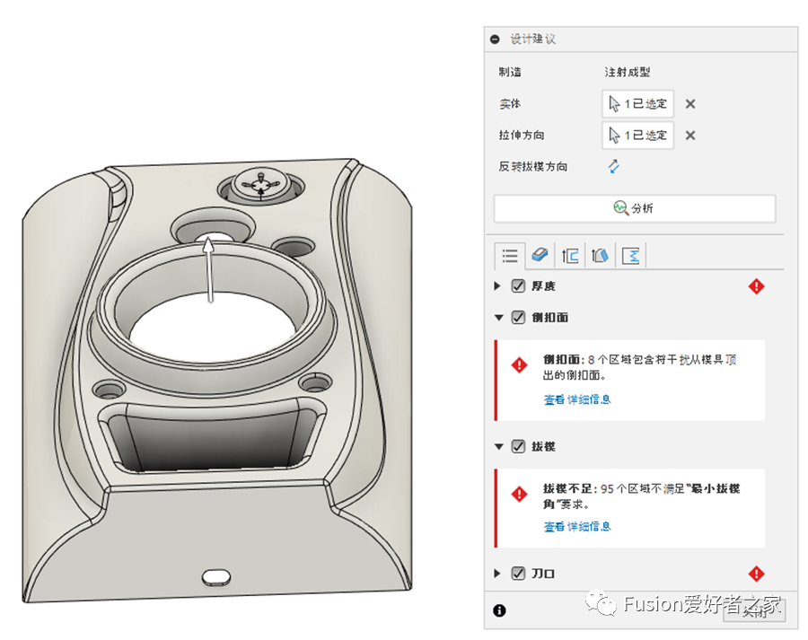 启动设计建议命令后,选择实体和拔模方向,然后单击“分析”。分析完成后,将显示规则、结果和建议。