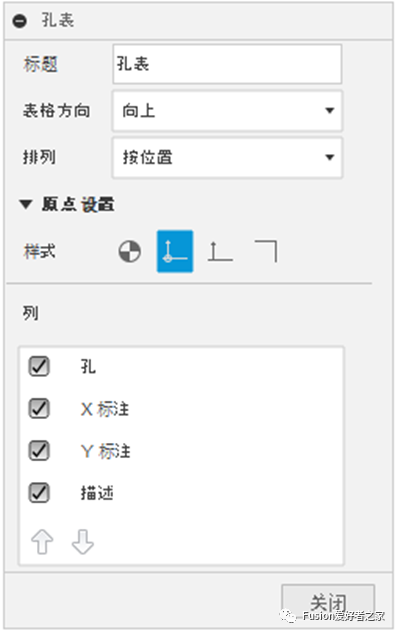 创建孔表时,可以依序修改孔表的名称,表格的方向(向上还是向下)以及排列的方式(按位置或按尺寸),也可选择原点的样式。放置好孔表后可以修改孔表格式,比如修改列的显示以及它们之间的顺序。界面如下图所示: