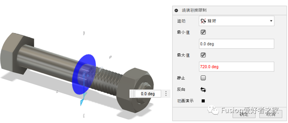 然后再编辑联接限制,分别在旋转和滑动方向上设置最小(一般为0)和最大值以约束螺母沿螺栓螺纹长度方向的旋转和移动。