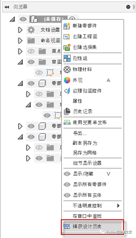 • 草图拖动完成后,右键单击列表中的顶部主零部件并选择“捕获设计历史”