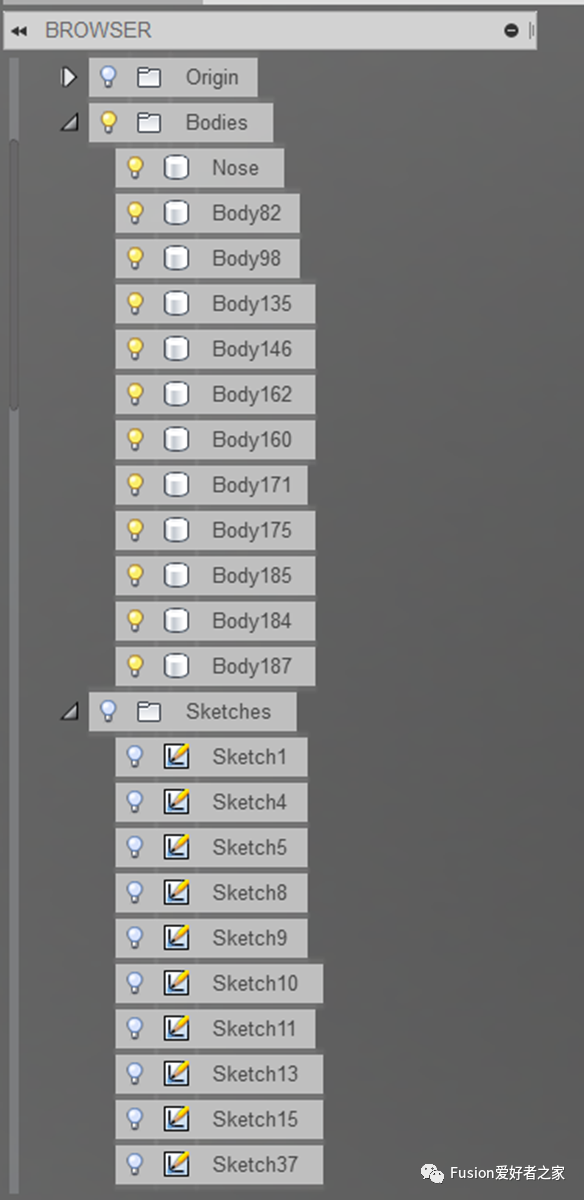 作为一个反例,看看下面这个模型浏览树。从模型浏览树上可以看到实体和草图都是通用型的命名,没有办法快速识别它们分别对应的内容,在对实体或草图操作编辑时,只好一个个的去查看是不是需要操作的对象,这样将大大降低设计效率和设计的可读性。当把这个数据分享给他人时,他也同样需要花费大量的时间来解读设计过程。