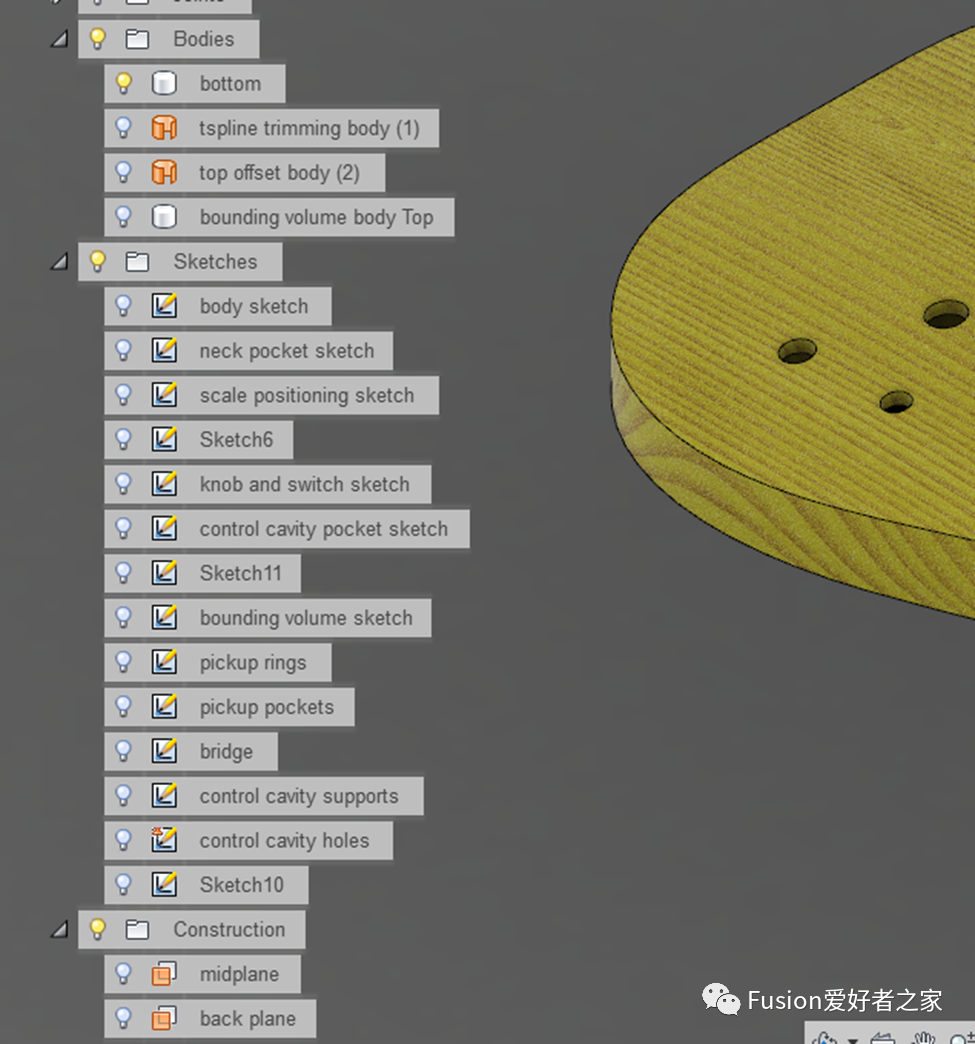 没有什么比几个月后看着自己的设计,并试图记住:“当时,我是如何设计制作这某一小部分的?”更令人沮丧的是怎么都不记得了。解决方法是命名您的特征,命名草图、构造几何、特征等。Fusion 360允许您命名每个条目,因此您应该使用它。下图是一款吉他设计的特征: