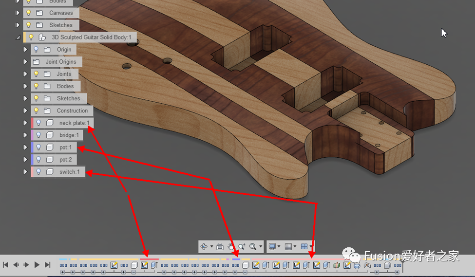 请注意,这与#1规则不同。这条规则是关于组织您的设计,让您的零部件拥有组成它的部分。这条建议是关于一个干净的时间轴线组织。“我忘了遵循这个提示。我可以在事后修复我的模型吗?”这个问题的答案是“也许”。这取决于您的模型是如何构建的。正如我们稍后将看到的,这完全取决于您建立了什么样的关系。如果您的零部件之间的关系良好且干净,您可以经常在您的时间线中重新排列特征来实现这一点。对于前面提到的吉他机身设计,以下是没有分组的时间表: