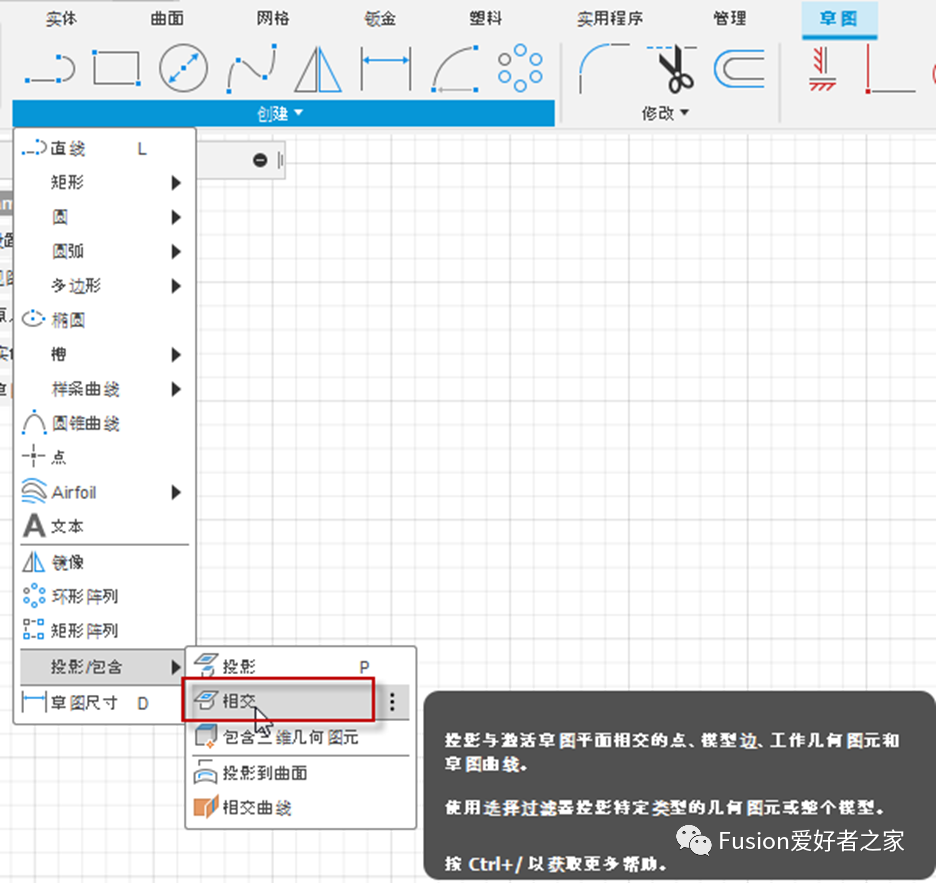 启动草图创建后,通过草图选项板打开断面图选项,可以查看到横断面与现有实体的轮廓交线。假如您在新的草图里面想投影某部分或全部截面轮廓到当前草图中,可以通过创建->投影/包括->相交命令: