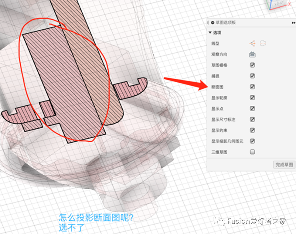 最近看到有用户在询问如何在草图中投影断面图,如下图所示,打算投影中间圈出的部分轮廓截面线到当前草图中。这个在Fusion 360中是可以很容易实现的,只是操作命令隐藏得有点深。