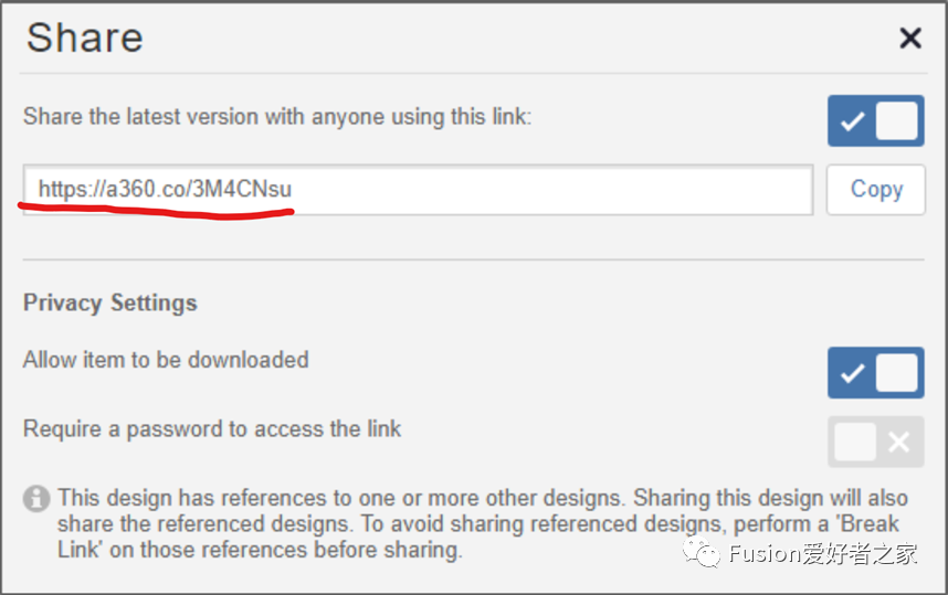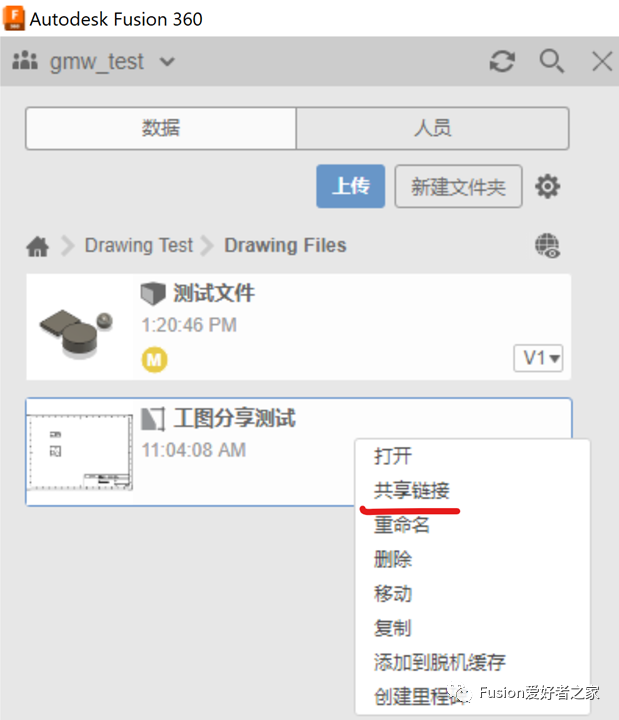 Fusion 360最大的特点就是数据是云存储的,非常便于设计分享。这里就简单介绍一下分享设计的流程。