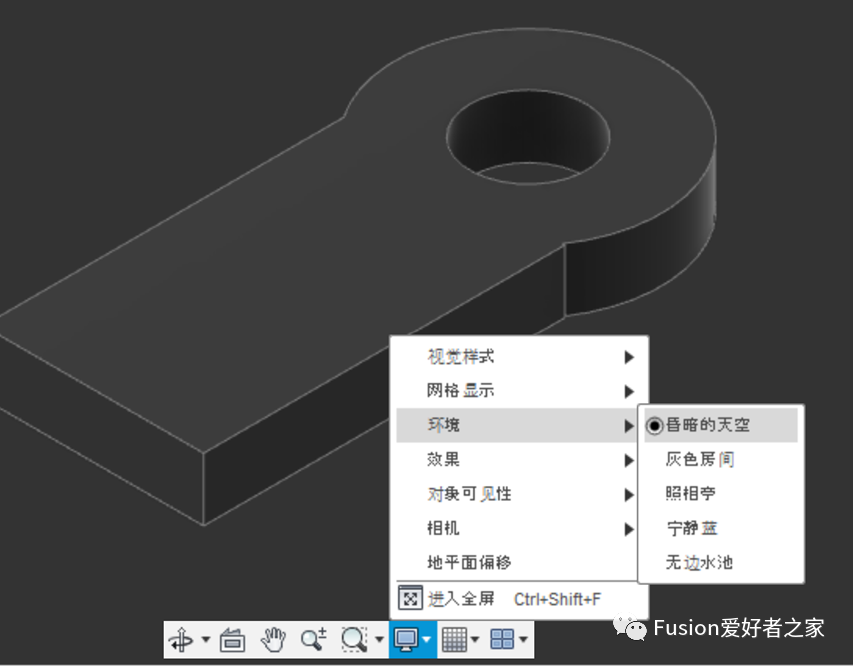保存这个文件并重新启动Fusion 360。在Fusion 360环境中,切换到已修改的环境(在我们的示例中为“昏暗的天空”):