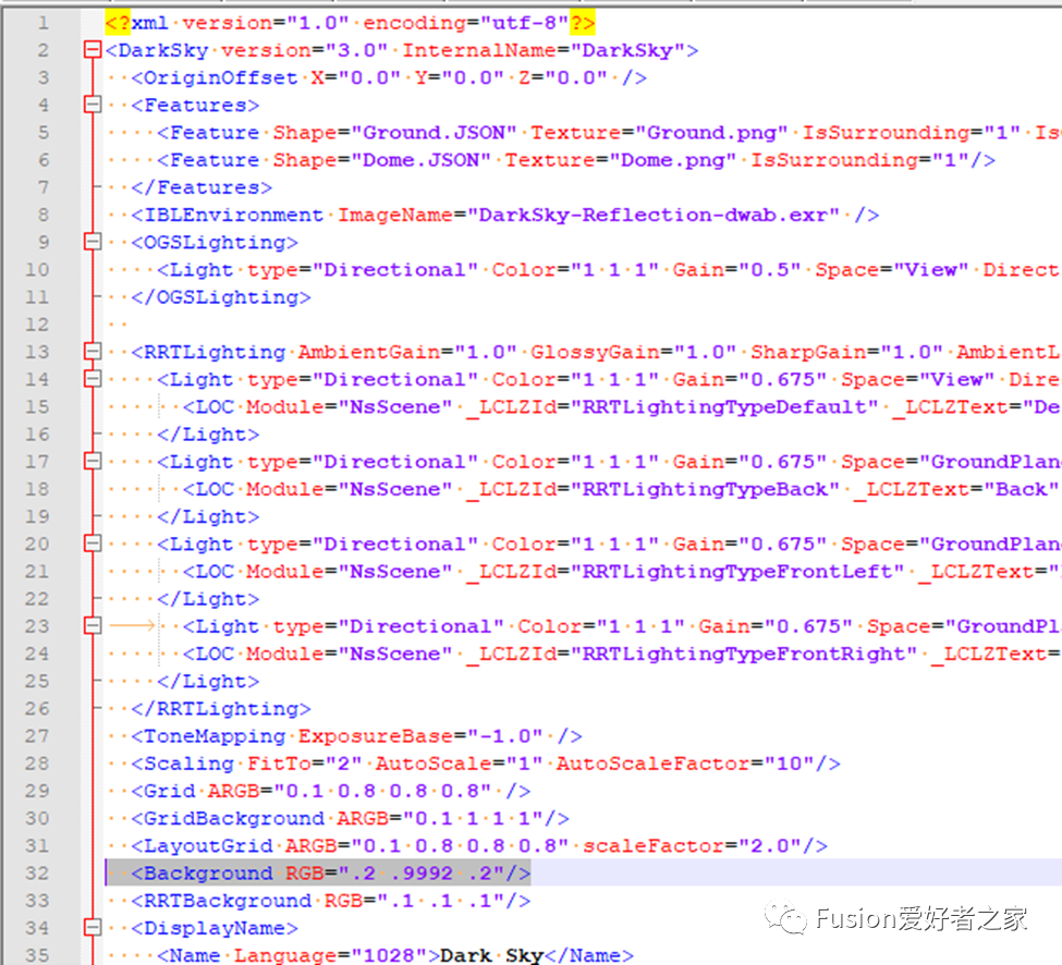 (您可以在桌面上Fusion 360 启动图标的目标文件夹中的INI文件上找到该文件夹) 使用记事本或在其他文本编辑器中打开XML文件,然后编辑背景的RGB值:
