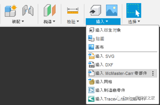 目前Fusion 360还没有提供统一的标准件库(虽然有些功能模块已经提供了一些行业标准件)。McMaster Carr是一个提供工程标准零部件的在线商店,您可以下载几乎所有目录的3D模型。Fusion 360已与他们的网站集成,因此可以从“插入”下拉菜单中选择插入其中的标准零部件。