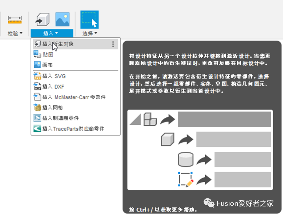 Fusion 360中有两个衍生命令。创建->衍生插入衍生对象。这个工具为Fusion 360释放了大量的能量,这在以前是不可能的。两个很好的例子是: