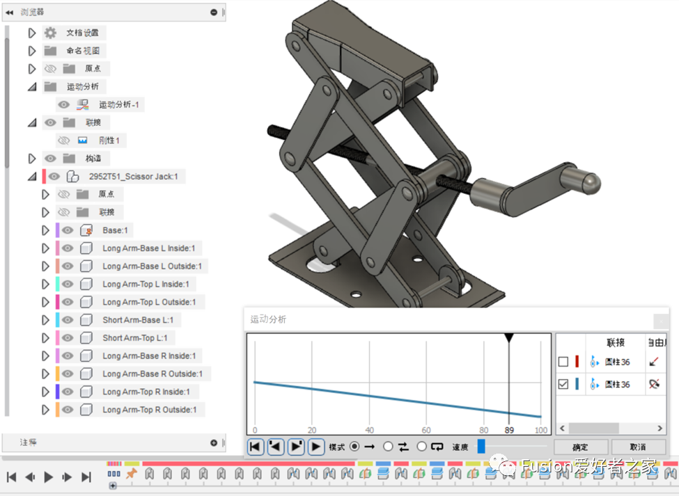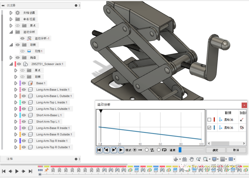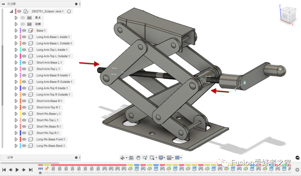 最近在Fusion 360的论坛上看到一个解决联接中的运动链接问题的实际案例,现分享给大家。用户的场景是他通过插入McMaster Carr里面的剪式千斤顶模型文件,然后将所有实体转换为组件,重命名并在模型浏览器中排序,再打开了“捕获历史”后,用户开始制作可以让千斤顶移动的联接。从手臂开始,从底座到鞍座,到此为止都还没问题。他又创建了一个用于转动螺杆的基本手柄,但他无法使其工作。即使用户使用了一个更简单的示例(是在Autodesk Gallery中找到的),该示例使用了2个运动链接,用户可以让一个工作,但另一个却不行。