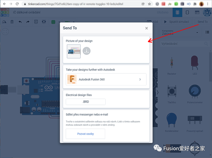 在TinkerCAD电路设计环境中,从“运行模拟”旁边选择“发送到”,然后在对话框中单击“Autodesk Fusion 360”。这会将您的电子设计发送到Fusion 360中的电子设计环境中。