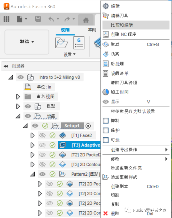 您可能已经知道,在制造工作空间中创建或编辑刀路时,可以右键单击任何输入框,并将该值设置为默认值。但是您不能用下拉值和复选框状态来实现这一点。为此,必须在刀具路径上单击鼠标右键,然后选择“比较和编辑”。