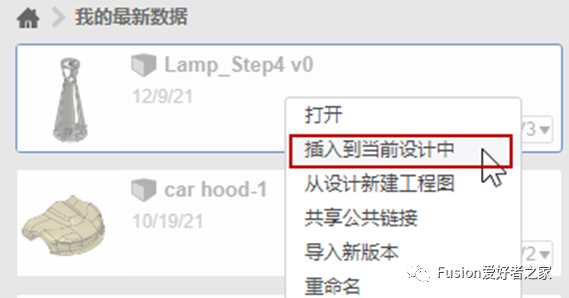 在项目设计中,您可能有时会希望将设计从一个项目引用到另一个项目中。这在Fusion 360中您登录到Fusion Team时就可以了。只需像平常一样,浏览到需要引用的设计数据后,拖放或右键单击并选择插入到当前设计中,就可以轻松实现。此外,衍生工具也可以跨Fusion团队中的项目工作。