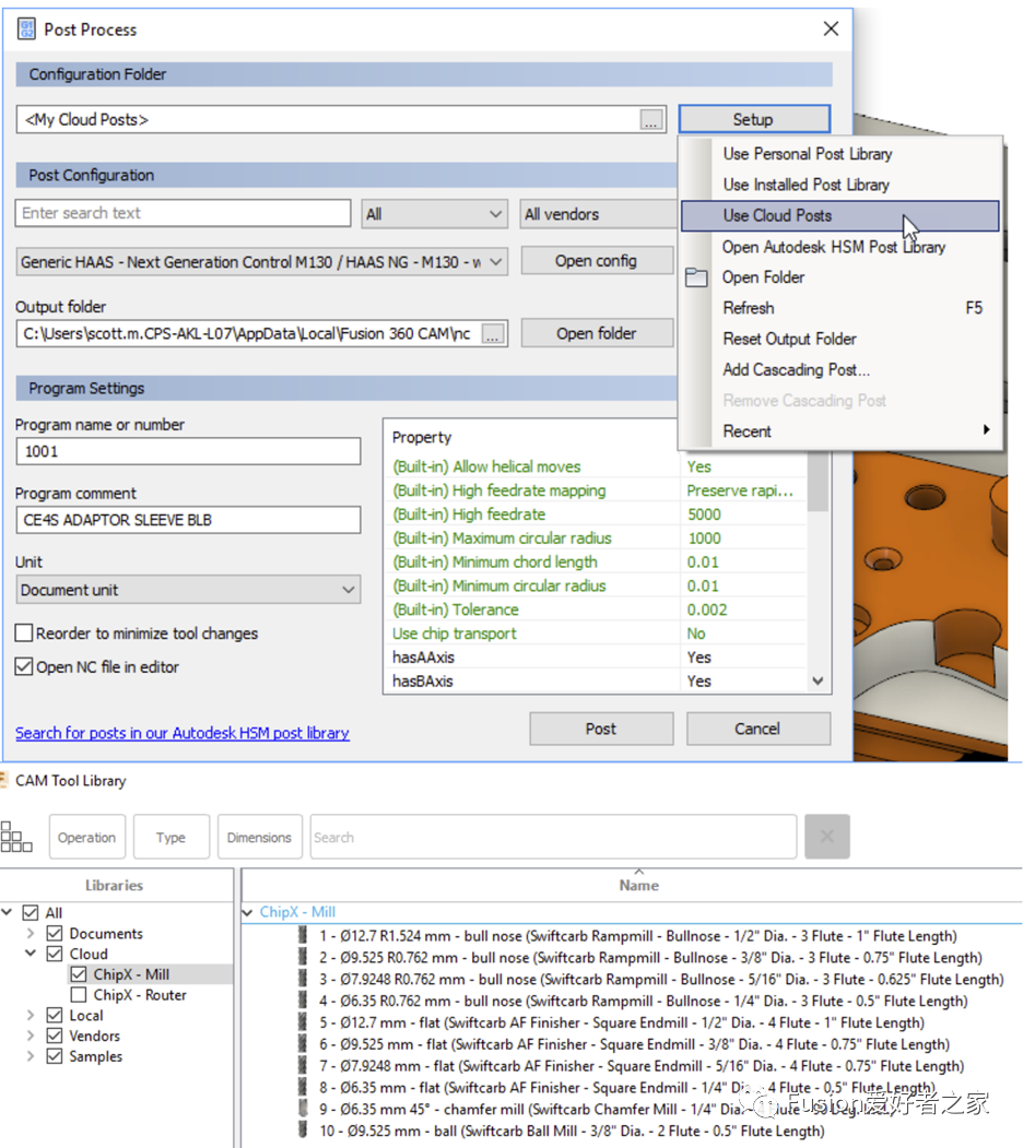 在该项目中,从机器配置、后处理器、刀具路径模板和刀具库创建了4个文件夹。将经过验证的后期处理程序上传到CAMPosts文件夹。设置此设置意味着您可以登录到任何设备,并访问您自己的所有自定义后处理、工具库和模板(如果您已经创建了)。因为这些文件都是由Fusion管理的,所以如果您愿意的话,您可以像您的设计一样对它们进行版本化。