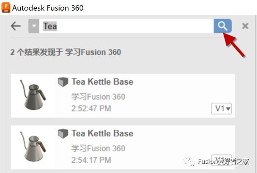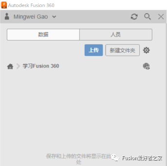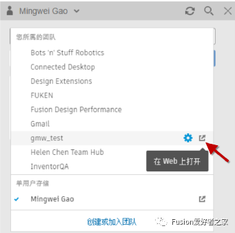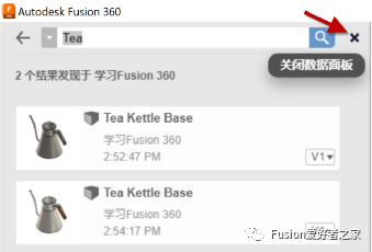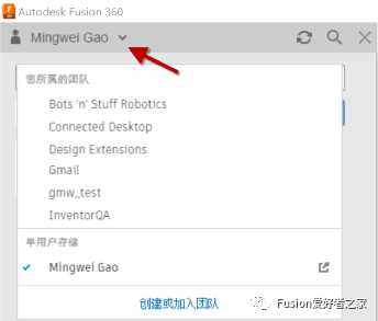 12.在数据面板顶部,选择并在团队之间切换。Fusion 360允许您加入多个团队。