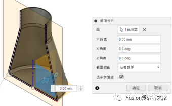 9.三维实体现在内部是中空的,壁的厚度为3毫米。现在检查模型内部以查看抽壳结果。在检验菜单中,选择截面分析工具。这将基于选定的面或平面生成模型的剖视图。