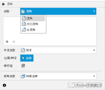 2.首先,定义圆角类型。要将圆角应用于茶壶的底部边缘,请将此设置保留为默认设置。