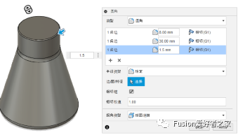3.要应用圆角,请选择所需的边或面,然后定义圆角半径。输入8毫米的值。