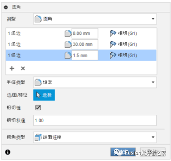 4.若要应用不同的圆角半径,请在对话框中选择“添加选择集”图标。这使您可以在应用不同于现有半径的半径时添加其他边、面或特征。为此中间边缘键入30毫米。请注意,应用圆角边有助于混合两个截面。