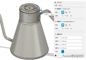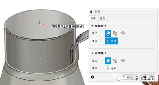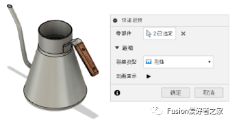 2.使用快速联接,您可以将茶壶底座“固定”到顶层组件的原点。激活后,可以选择要连接在一起的两个组件。在这种情况下,是茶壶基础组件,然后是“根”或顶层组件。Fusion 360提供七种独特的联接类型。“刚性”的作用就好像你要把它们粘在一起或焊接在一起。