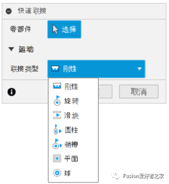 1.联接是一种机械关系,定义了两个Fusion 360部件或组件之间的相对位置和运动。“装配”下拉列表中有两种类型的联接。标准联接工具在尚未处于所需位置的零部件之间创建连接。快速联接在已正确定位的零部件之间创建连接。