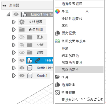 图1另存为网格可在Fusion 360浏览器的零部件的右键菜单中找到