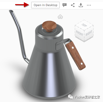 图7. 选择在Fusion 360桌面程序中打开以在Fusion 360应用程序中打开文件