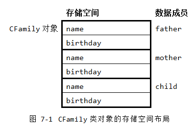 可以推断,一个家庭对象必然包含father、mother、child三个CPerson类对象,称之为对象成员或者子对象。进而,每个CPerson类对象又必然包含一个CDate类的子对象birthday。在图 7‑1中,就给出了CFamily对象的存储空间布局。