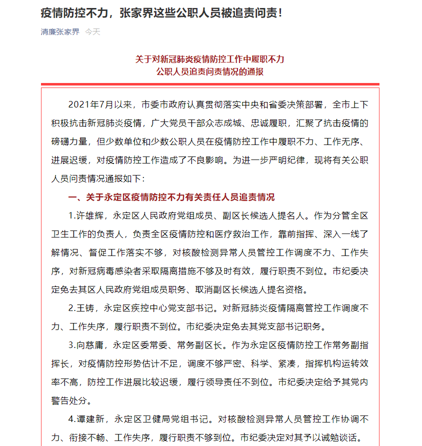 2021年7月以来,张家界市委市政府认真贯彻落实中央和省委决策部署,全市上下积极抗击新冠肺炎疫情,广大党员干部众志成城、忠诚履职,汇聚了抗击疫情的磅礴力量,但少数单位和少数公职人员在疫情防控工作中履职不力、工作无序、进展迟缓,对疫情防控工作造成了不良影响。为进一步严明纪律,现将有关公职人员问责情况通报如下:1.许雄辉,永定区人民政府党组成员、副区长候选人提名人。作为分管全区卫生工作的负责人,负责全区疫情防控和医疗救治工作,靠前指挥、深入一线了解情况、督促工作落实不够,对核酸检测异常人员管控工作调度不力、工作失序,对新冠病毒感染者采取隔离措施不够及时有效,履行职责不到位。市纪委决定免去其区人民政府党组成员职务、取消副区长候选人提名资格。2.王铸,永定区疾控中心党支部书记。对新冠肺炎疫情隔离管控工作调度不力、工作失序,履行职责不到位。市纪委决定免去其党支部书记职务。3.向慈庸,永定区委常委、常务副区长。作为永定区疫情防控工作常务副指挥长,对疫情防控形势估计不足,调度不够严密、科学、紧凑,指挥机构运转效率不高,防控工作进展比较迟缓,履行领导责任不到位。市纪委决定给予其党内警告处分。4.谭建新,永定区卫健局党组书记。对核酸检测异常人员管控工作协调不力、衔接不畅、工作失序,履行职责不够到位。市纪委决定对其予以诫勉谈话。二、关于张家界市人民医院古庸路院区疫情防控不力追责情况1.邓华斌,市人民医院老院区急诊科主任。作为急诊科核酸检测点现场管理第一责任人,风险意识不强,不亲临现场,调度指挥不力,造成检测点秩序混乱、人员扎堆,没有按规定标准保持安全距离,存在严重的交叉感染、院内感染的风险,对此问题负有直接责任。市纪委决定免去邓华斌急诊科主任职务。2.胡观成,市人民医院副院长。作为负责院区疫情防控工作和预防院内感染工作的分管领导,敏感性、责任心不强,对核酸检测点秩序混乱、人员扎堆的问题,没有采取有效措施进行整改,导致事情继续发生,对现场存在的问题没有及时予以纠正处理,对发生的问题负有主要领导责任。市纪委监委决定对胡观成给予政务警告处分。3.黄红,受委托负责院区全面工作,未全面尽责,指导、督促不力,对发生的问题负有重要领导责任。市纪委对黄红提醒谈话。4.邓绍勇,市人民医院综治办副主任。对保安人员履职情况监管不严,对发生的问题负有重要领导责任。市纪委决定对其约谈。5.蔡章、李琳作为现场管理人员,对存在的问题没有及时报告,履责不力,对发生的问题负有一定责任。市纪委决定对蔡章、李琳进行批评教育。1.胡华健,武陵源区文化旅游广电体育局综合行政执法大队大队长,负责对魅力湘西演艺场所常态化疫情防控工作进行监督管理。魅力湘西观演期间游客未全程佩戴口罩,演出场次之间的消杀不够彻底。武陵源区文旅局发现企业疫情防控问题后,在督促企业整改落实、复查企业是否整改到位等方面工作不扎实不细致,后续跟进监管不力。2021年7月26日至30日,多地网络舆情爆料魅力湘西关联病例,引起较大社会反响。对此,胡华健负有直接责任。市纪委决定给予其党内严重警告处分。2.庹鸿,武陵源区文化旅游广电体育局产业股股长,负责对魅力湘西演艺场所常态化疫情防控工作进行监督管理。对魅力湘西演艺场所常态化疫情防控不力负有直接责任。市纪委监委决定给予其政务记大过处分。3.张碧波,武陵源区文化旅游广电体育局党组成员、副局长,分管执法大队。对魅力湘西演艺场所常态化疫情防控不力负有主要领导责任。市纪委决定给予其党内警告处分。4.邓秀莉,武陵源区文化旅游广电体育局党组成员、副局长,分管产业股。对魅力湘西演艺场所常态化疫情防控不力负有主要领导责任。市纪委决定给予其党内警告处分。5.向延初,武陵源区文化旅游广电体育局局长,主持全面工作。对魅力湘西演艺场所常态化疫情防控不力负有重要领导责任。市纪委决定对其予以诫勉谈话。6.彭斌,武陵源区文化旅游广电体育局党组书记,主持全面工作。对魅力湘西演艺场所常态化疫情防控不力负有重要领导责任。市纪委决定对其予以诫勉谈话。7.秦进廷,武陵源区人大主任候选人,此前任武陵源区副区长,分管文化体育旅游工作。对魅力湘西演艺场所常态化疫情防控不力负有领导责任。市纪委决定对其予以批评教育。8.谢贵湘,现任武陵源区委副书记,联系文化体育旅游工作。对魅力湘西演艺场所常态化疫情防控不力负有领导责任。市纪委决定对其予以约谈。当前,我市疫情防控形势严峻,全市各级各部门各单位要深刻汲取教训,切实引以为戒。全市各级党组织要切实把思想和行动统一到习近平总书记关于疫情防控工作的重要讲话精神上来,认真落实中央、省委、市委各项决策部署,坚持人民至上、生命至上,切实做到守土有责、守土担责、守土尽责。全市党员干部特别是领导干部要坚守岗位、以身作则、率先垂范,力戒形式主义、官僚主义,确保疫情防控工作落实到位。全市纪检监察机关要发挥监督保障执行、促进完善发展作用,做到疫情防控工作开展到哪里,监督检查就跟进到哪里,从严监督执纪问责,为做好疫情防控提供坚强纪律保障。2021年8月3日