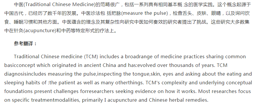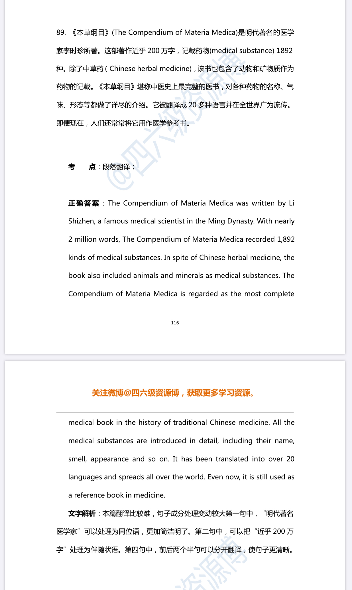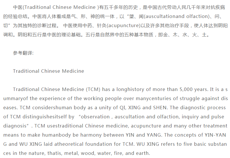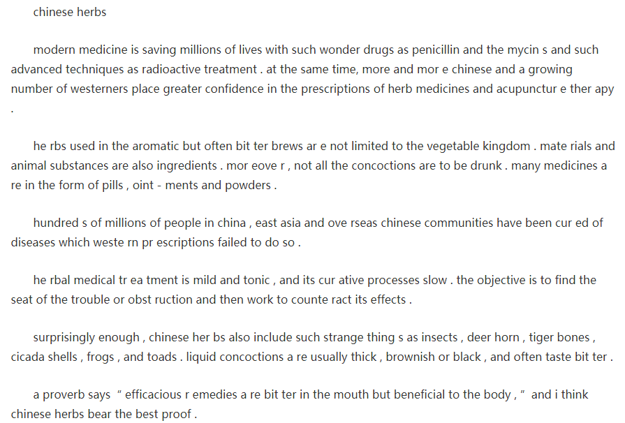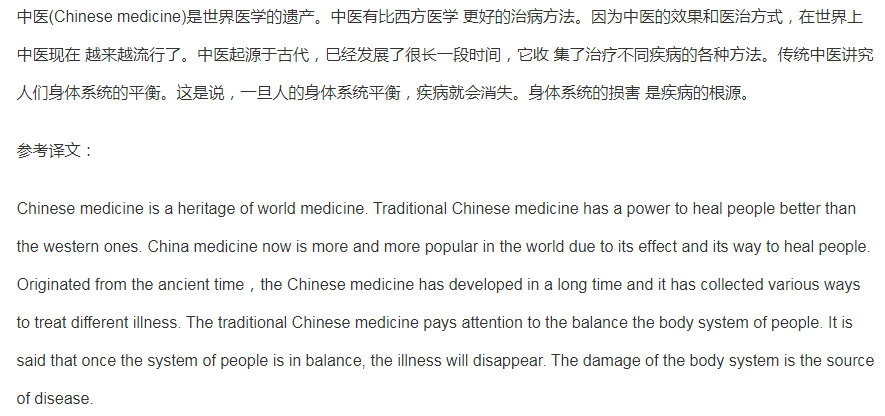 本文是一篇说明文, 文中第一段从西药到西医治疗引出中药和中医治疗, 以下用四小段介绍了中药的特点、成份以及惊人的疗效。最后用一句谚语“ 良药苦口利于病”结束全文。本文除一些专门名词外, 结构比较简单, 可供四、六级学生学习。