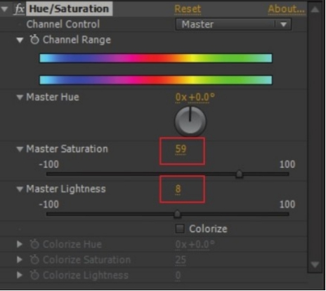 (17)从项目窗口中将C5和alpha放入时间线中,将alpha放在C5层的上方作为C5层的蒙版。将这两层转化为与合成,并命名为Diamond5.将钻石的饱和度和亮度调整得更高一些。为其添加色相/饱和度,修改参数;