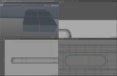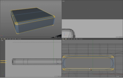 1.创建立方体与手机壳下面的部分近似等大,横向创建两个循环切割切出数据电子片的位置,纵向创建一个循环切割(50%),前面两个边和上下两个边分别制作倒角(细分为3);
