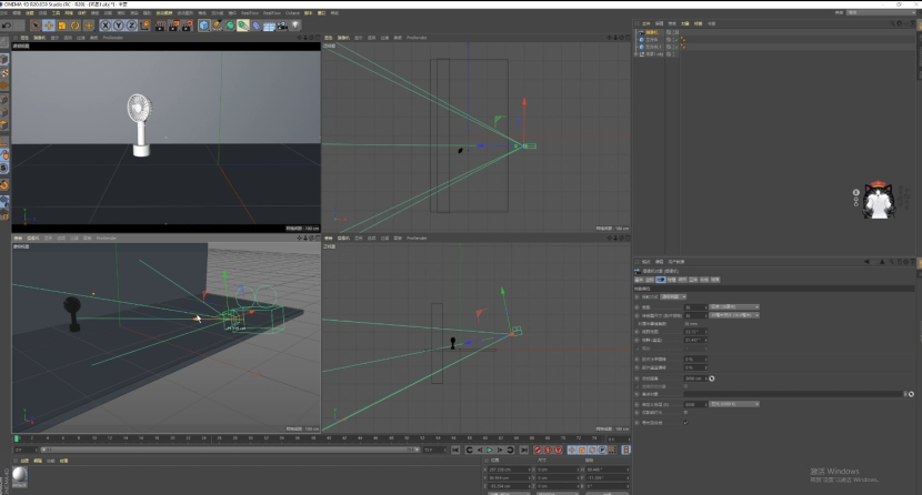 3.创建摄像机调整位置,并在C4D标签下选择保护,稳定摄像机。并将右视图改为光影着色线条,视图改为透视窗口;