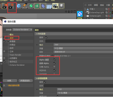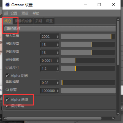 11.渲染设置 打开alpha通道打开直接alpha oc里面同样打开alpha。
