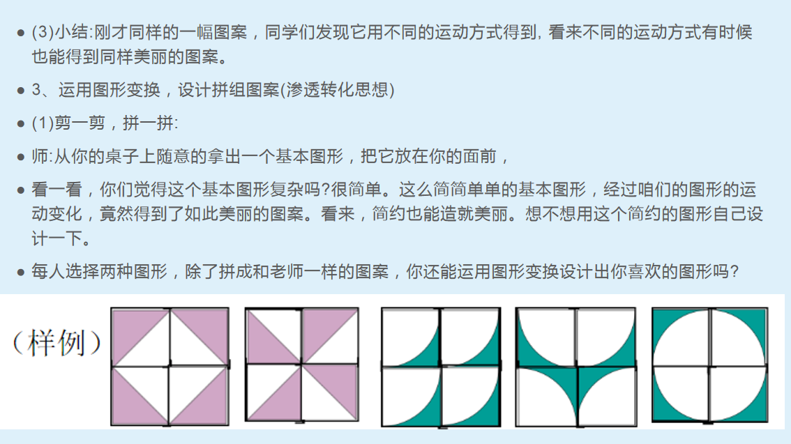 (3)小结:通过图形的变化,一个个基本图形“转化”成了一幅美丽的图案,这就是同学们用数学为我们生活创造的美。