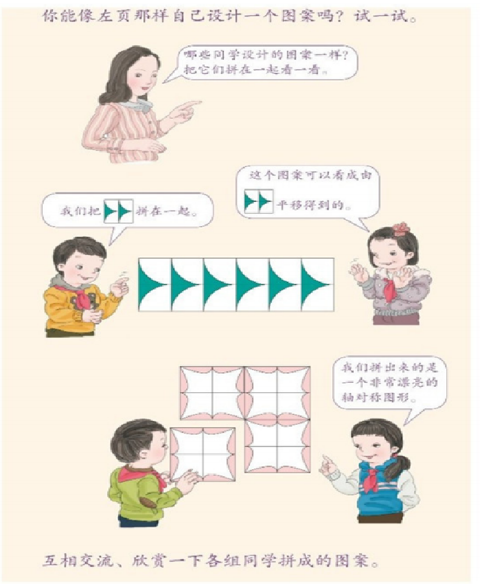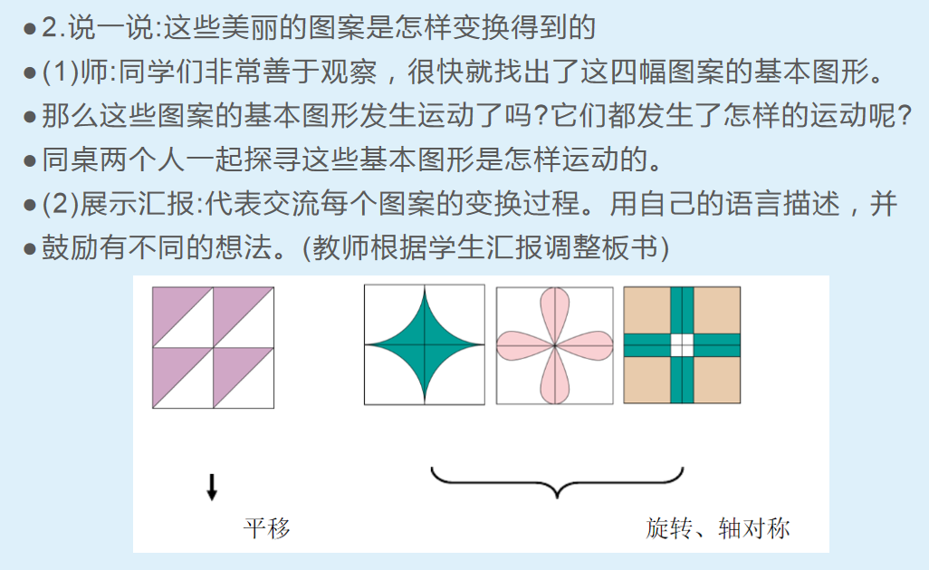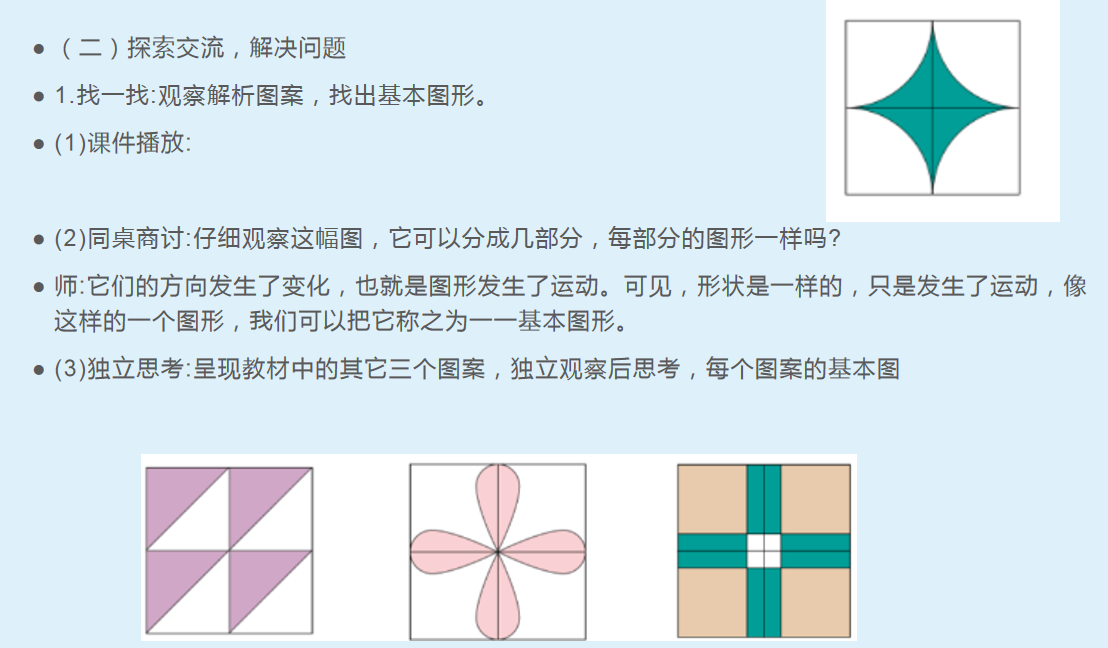3、让学生经历观察、操作及合作交流的过程,获得用图形的运动设计图案的基本方法,在想象图形运动的过程中发展学生的空间观念。