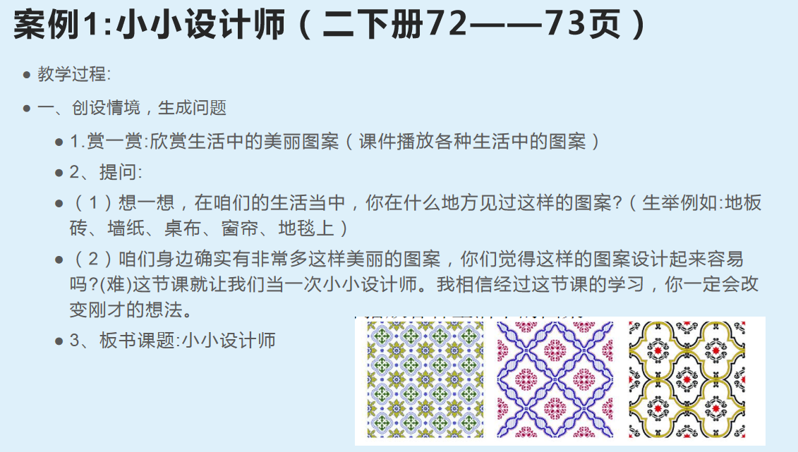 师:这么漂亮的图案,是用老师提供给你们的基本图形设计出来的。你们想不想通过自己的双手、自己的智慧创造、设计一个漂亮的基本图形,有了这个基本图形,你们就能设计出美丽的图案。