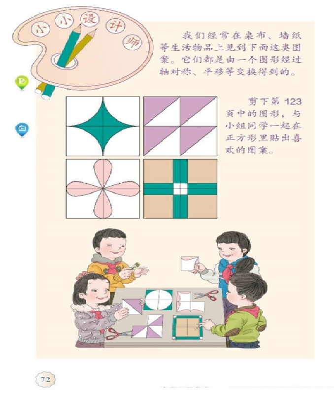1、能辨认出生活中的简单图案是由一个图形经过轴对称或平移等运动得到的。能在正方形中拼贴或设计图形,并将所设计的图形通过轴对称、平移等运动创造出自己喜欢的图案。