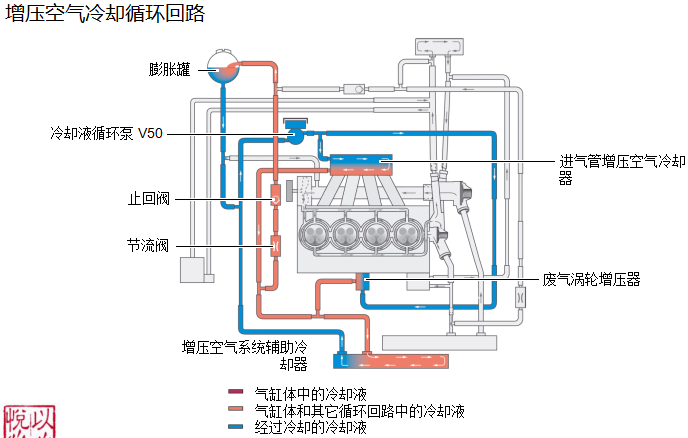 V50将膨胀罐中较低温度的冷却液抽出加压后分别输送给进气管内的增压空气冷却器和废气涡轮增压器。较低温度的冷却液进入到进气管增压空气冷却器后,与冷却器内的热空气发生热交换,将空气热量带走,导致进气温度降低,冷却液温度升高。温度升高了的冷却液被循环至位于车辆前部的增压空气系统辅助冷却器,然后利用冷却风扇将热量散发到大气中。冷却液温度又再一次降低,然后再次被冷却液循环泵V50泵入,如此完成了整个冷却循环。到废气涡轮增压器的循环回路与此相同,两个呈并联关系。