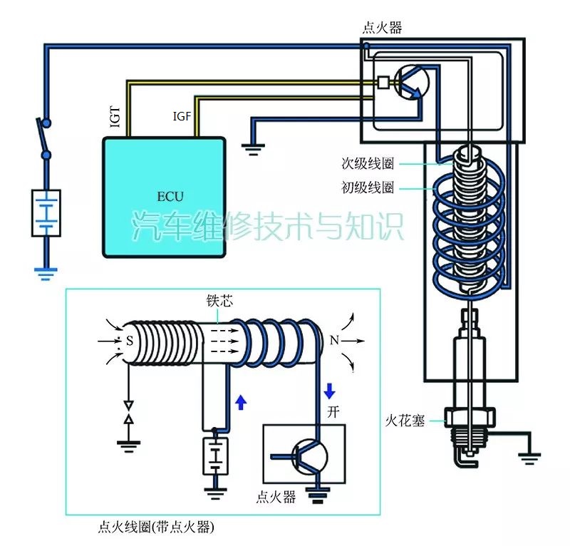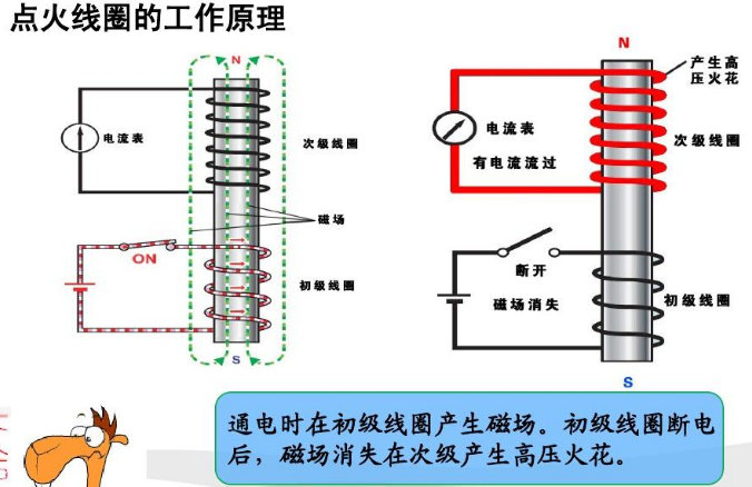 点火线圈工作原理(关键点:初级线圈断电后,次级线圈才感应出高压电)