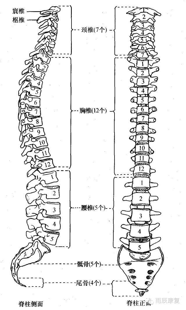 A颈椎7块 胸椎12块腰椎5块 1块骶骨(由5块骶椎合成)1块尾骨(由4块尾椎合成)
