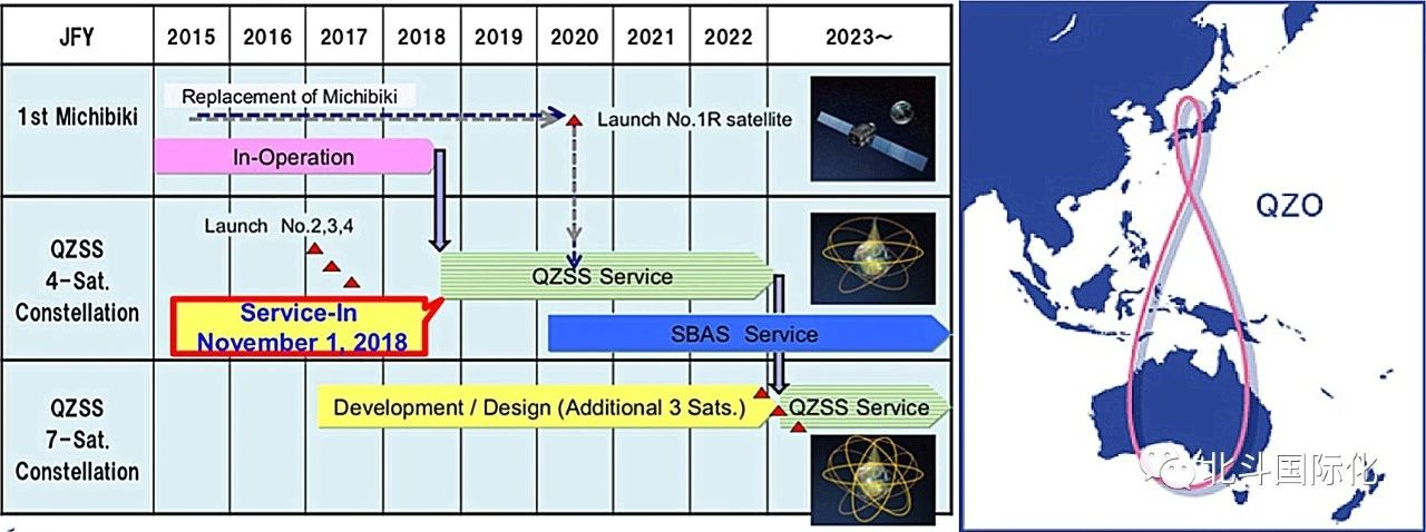 如图4所示,日本准天顶卫星系统是基于GPS卫星导航系统的补充星座。2020/2023年以后,还将接管称为多功能运输卫星(MTSAT)的日本(多功能)星基增强系统(SBSAT)(或称为MTSAT的卫星增强系统),目前主要为航空服务。在2023年之后,将增加3颗其他卫星用以拓展当前由4颗IGSO卫星组成的日本准天顶卫星系统。