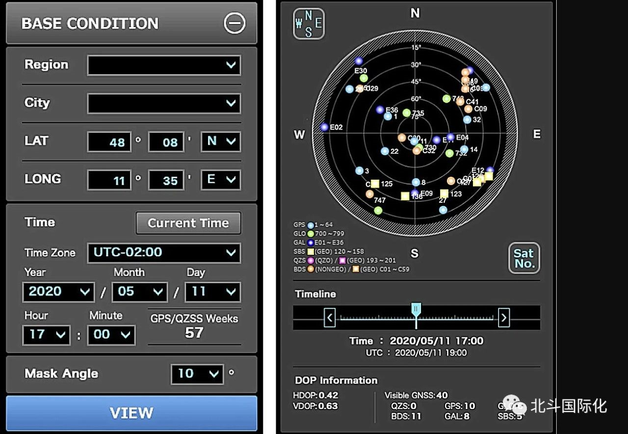 全球目前共有四个全球卫星导航系统,其中GPS和GLONASS系统已经完全可用,北斗三号计划在2020年上半年完成建设,Galileo卫星导航系统将在2020年至2021年初全面投入使用。假设视野不受阻,高度角为10°,2020年5月11日在慕尼黑将有35颗GNSS卫星能够被使用(见图1)。接收到5颗可以用于星基增强的卫星,基于此,一个GNSS系统建立完成(图2)。
