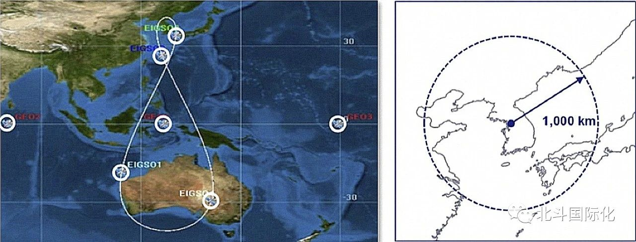 韩国政府在其第三次空间发展基本计划中决定于2018年2月规划自己的区域卫星导航系统。类似于NavIC系统和QZSS系统的3颗GEO卫星和4颗椭圆IGSO卫星,覆盖了韩国及其周围约1000公里的区域,见图5。