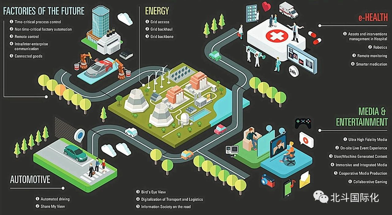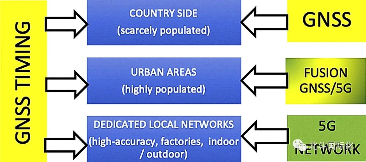 为了使电信运营商能够独立运行并在生产中实现室内和室外基于5G厘米或毫米级定位精度,大型工厂将会安装和运行自己的5G基站网。在定位导航的行业应用中GNSS可以替代5G(GNSS授时除外)。2.4 GNSS与城市5G融合